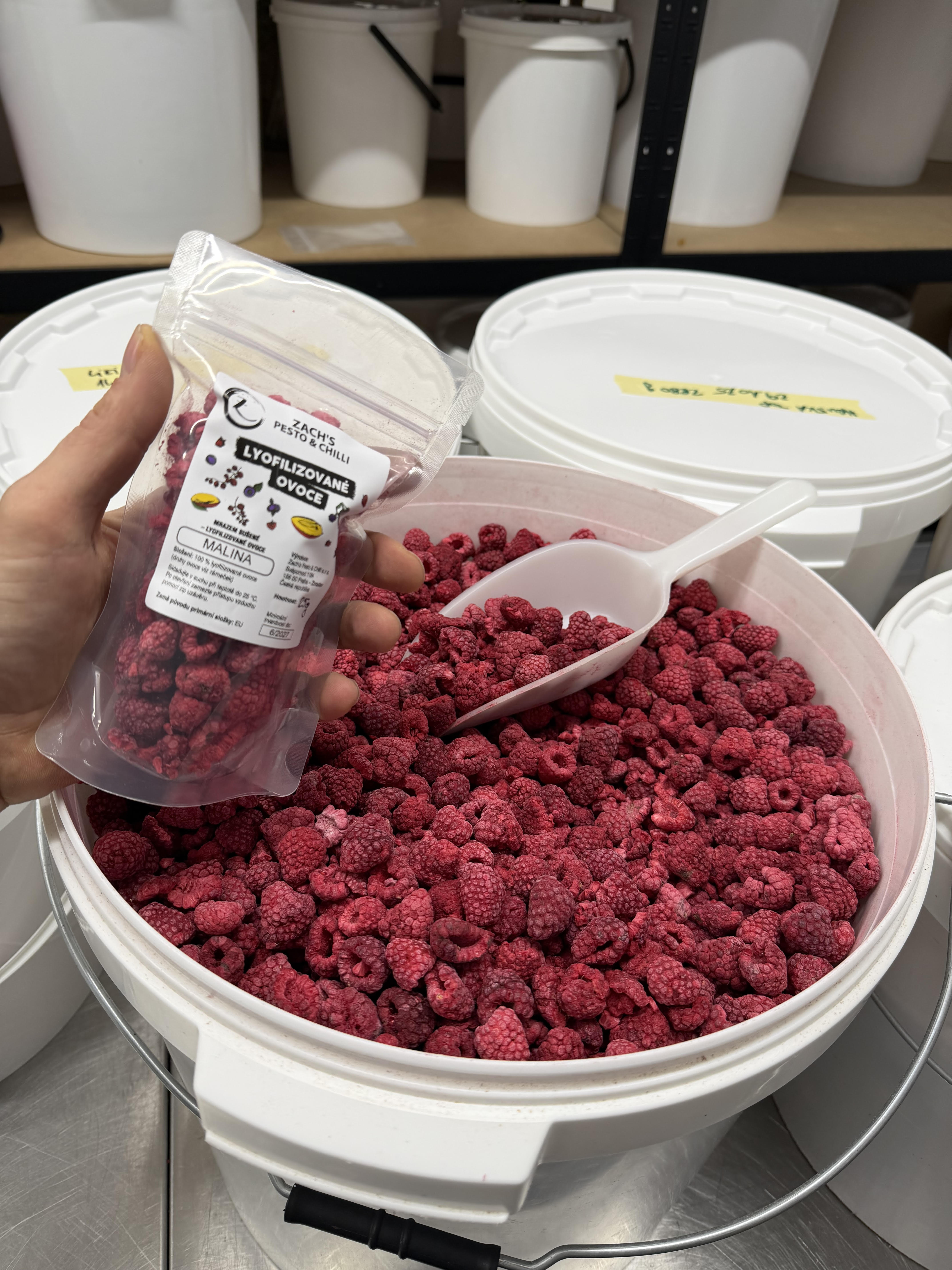 Na výrobu 100 g lyofilizovanách malin bylo použito přibližně 780 g čerstvých malin.